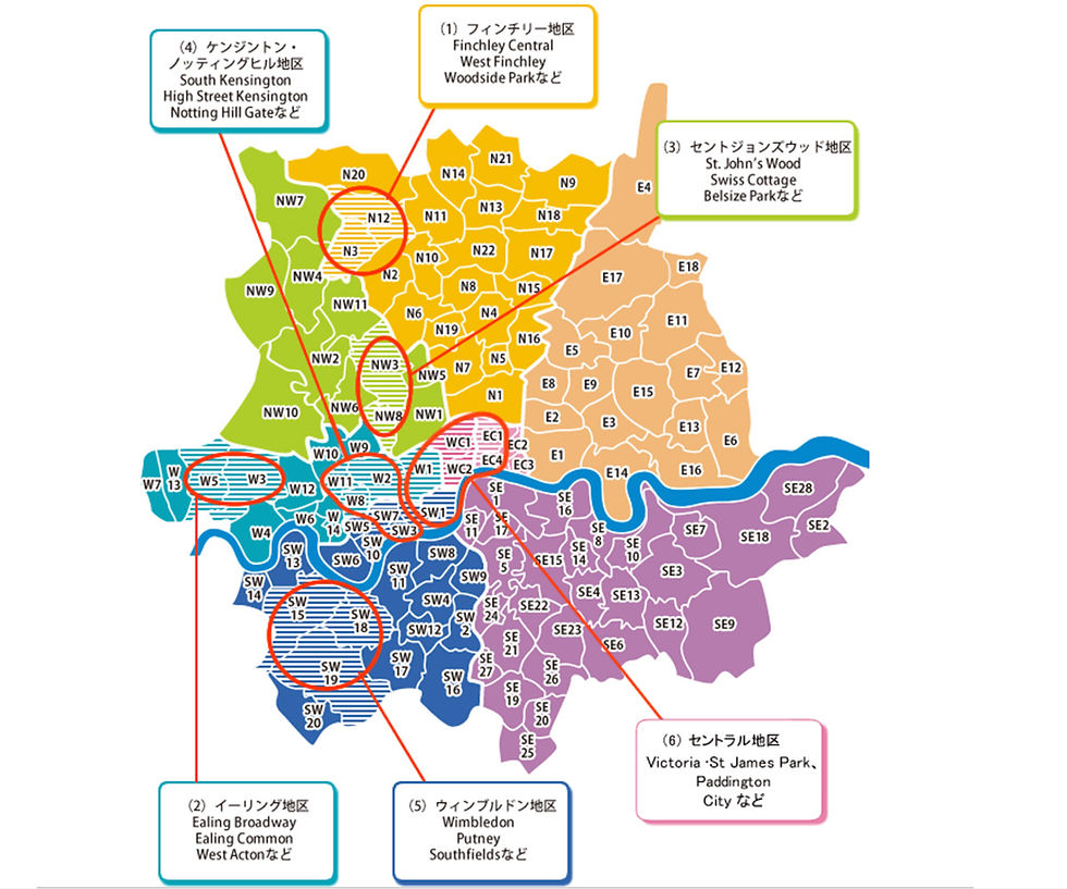 同じ街の中でもエリアによって雰囲気や条件が大きく異なります。以下は、ロンドンで多く日本人が住むと言われるエリアをわかりやすく地図にしたものです。(エイブルネットワークロンドン店様のHPより)